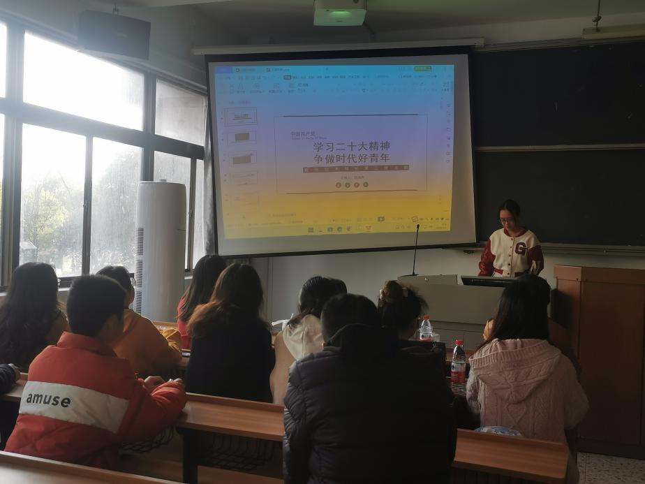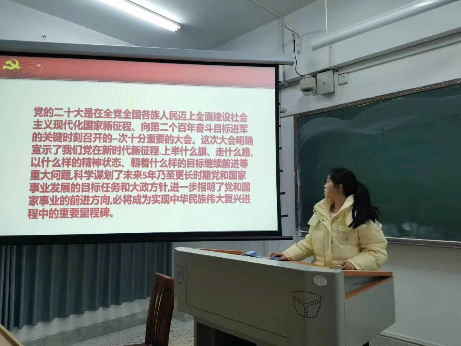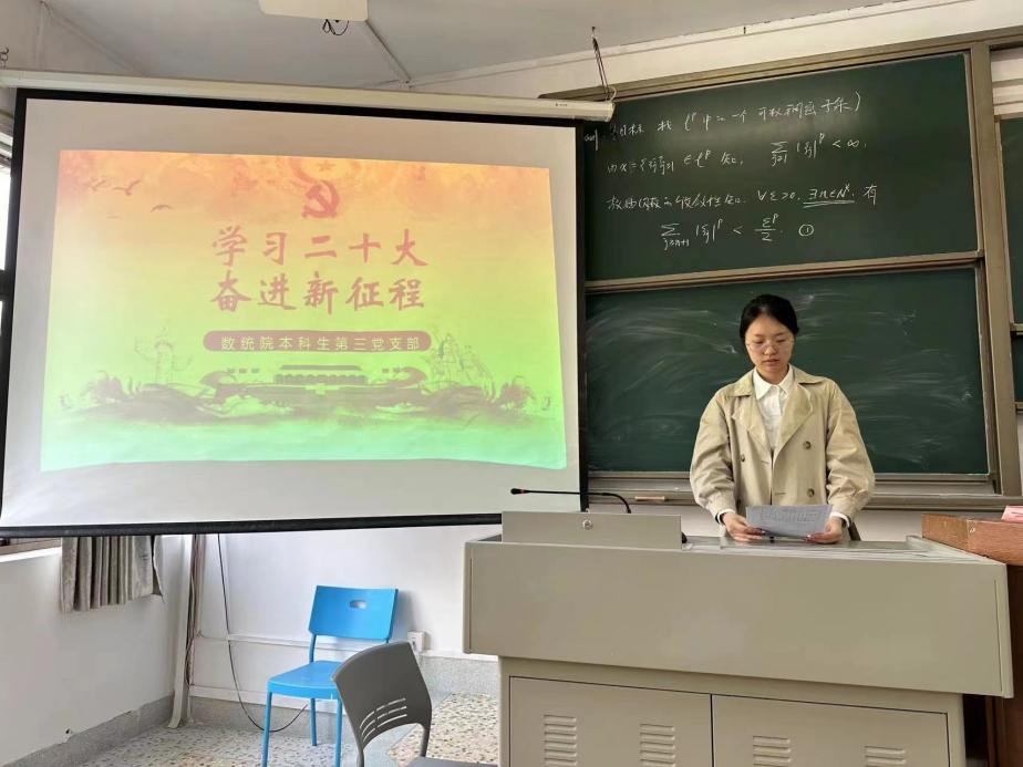 本科生数二党支部书记程南燕首先回顾了中共二十大的召开,采用问答互动的方式与支部党员学习了二十大的重要精神;联系当下,作为新时代的青年,当牢记习近平总书记对青年的嘱托:不断打磨自身本领,心念家国并与时代相连,永怀赤子之心,绽放青春绚丽之花;同时学习了作为一名合格党员的重要品质,讨论表达自己的感想。