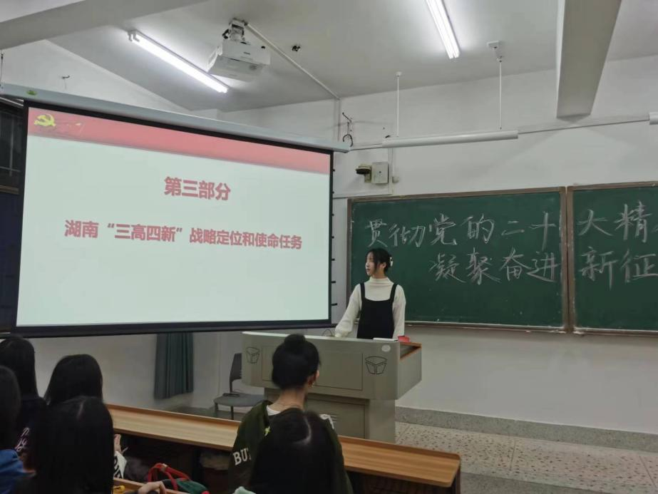 研数学教育与概率论党支部书记邹思琪介绍了“三高四新”提出的背景、含义、战略定位和使命任务。她指出,我们要更加紧密地团结在以习近平同志为核心的党中央周围,心系“国之大者”,干在实处、走在前列,自觉肩负起“三高四新”战略的使命任务,在服务现代化新湖南建设中体现青年担当,书写青春华章。