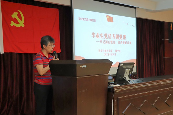 (通讯员 石卓 杨震坤 曹慧娟)6月10日下午,365英国在线体育毕业生党员主题党日活动在格物楼309报告厅举行。公司党委专职组织员覃志斌老师主持活动。公司党委书记颜中玉、副书记涂榉耀,党委委员、“计算与随机数学”教育部重点实验室副主任刘亚琴,党委委员、院组织人事秘书林虹,学工办主任李俐,公司党委组织人事秘书熊绍英(前)出席此次活动。