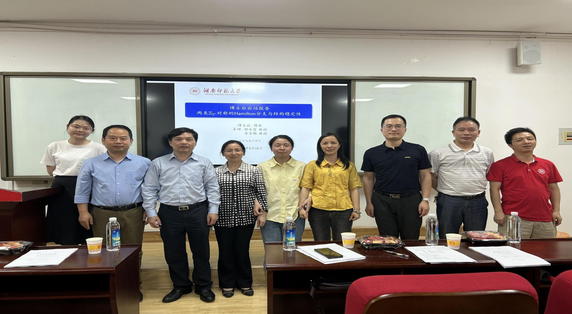 会上,郭水霞教授首先介绍了出席本次出站考核会的各位专家,然后介绍了周杏博士的基本情况。随后,周杏博士后汇报了进站以来的研究情况,主要讨论了一类与超临界哈密顿pitchfork分支有关的0:1共振Floquet-周期轨分支以及一类与超临界哈密顿pitchfork分支有关的Floquet-环面分支, 结合KAM理论和奇点理论等详细研究了它们的分支图以及分支现象在小扰动下的结构稳定性等问题。最后,评审专家对周杏博士后在站期间取得的业绩成果进行了评估并给予了充分的肯定,对其下一步的研究工作提出了建设性意见和建议,最终经评审组考核,周杏博士后通过出站考核。