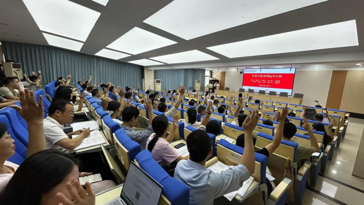 随后,公司工会主席龚也君提交了公司劳务分配条例起草小组名单,供全院教职工大会审议,经全员举手表决,一致通过了该名单。