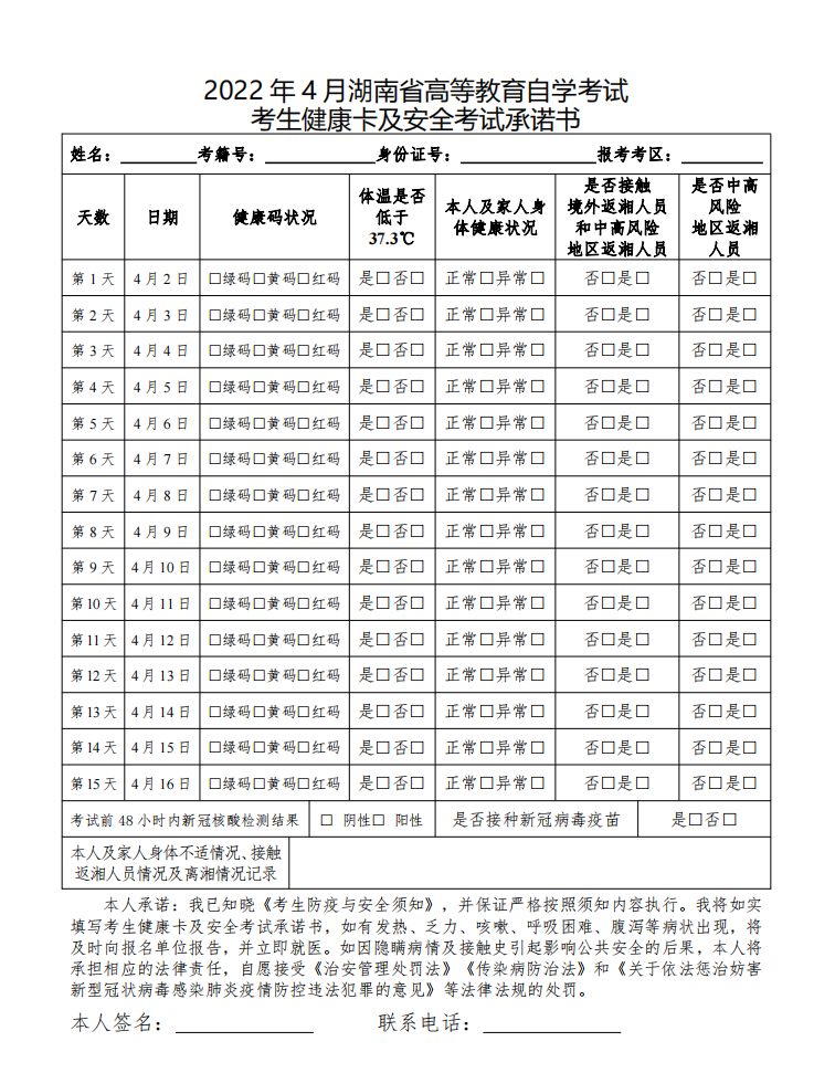 1. 通过“湖南省高等教育自学考试自助服务系统https://zikao.hneao.cn/net/”(以下简称自助服务系统)自行下载打印并按要求填写《2022年4月湖南省高等教育自学考试考生健康卡及安全考试承诺书》。