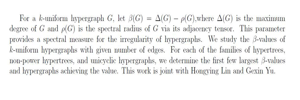 报告人简介:周波,华南师范大学教授, 博士生导师。主要研究领域为组合矩阵论、代数图论及其应用。目前主要感兴趣的领域是图与超图谱理论。与合作者在国内外专业杂志上发表论文100多篇,被SCI论文他引5000多次。主持多项国家自然科学基金项目及1项高校博士学科点专项科研基金项目的研究。曾获广东省科学技术二等奖(2000)、霍英东教育基金会高等院校青年教师奖(2002)。入选爱思唯尔2014-2021年中国高被引学者榜单(数学)。