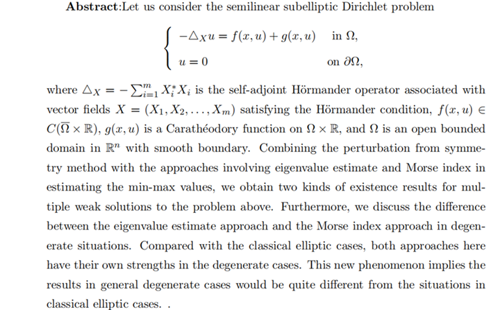 报告题目: Multiplicity of solutions for semilinear subelliptic Dirichlet problem
