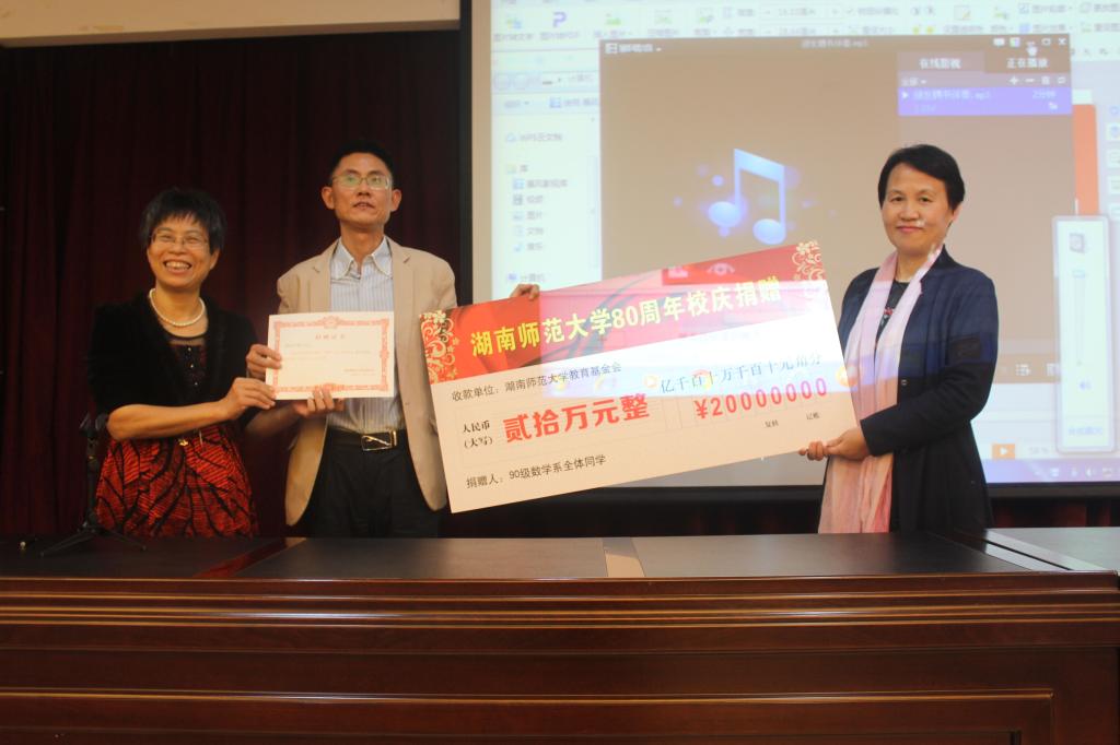 经理谢资清代表公司接受了数学系75级二班、79级、87级、90级、91级、93级、95级全体员工,王伟民、陈华、杨立祥、曾磊员工,长沙耀发科技开发有限公司,郭晋云老师、谢资清老师研究生团队等的捐赠,党委书记颜中玉为捐赠员工依次授予了捐赠证书。
